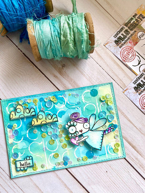 Undoubtedly the most fun part is the composition, in addition to being the one that takes the longest time hahaha. I chose the girl from stamp set #357 Fly by Janet Klein as the protagonist. Finally, here are some photos with details of the project.
